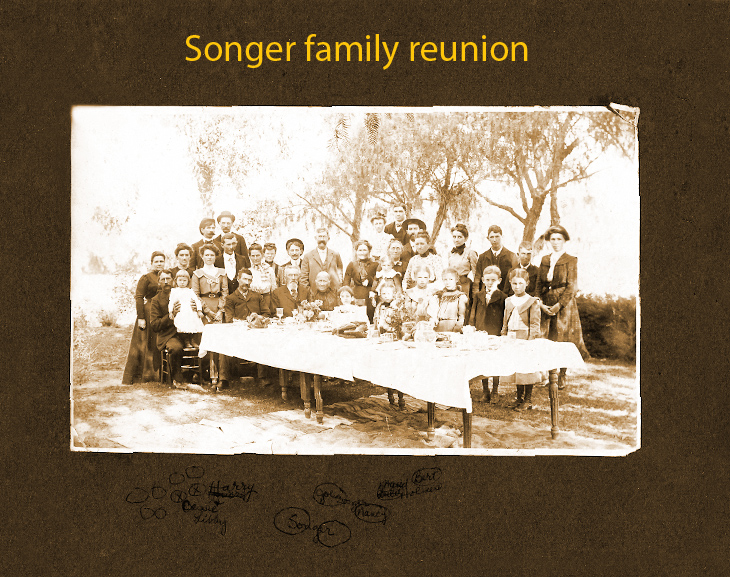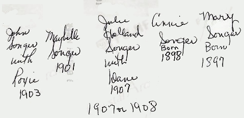 ![]() John L. Songer and wife Susana with there children Charlie H. Songer, Emmitt M. Songer, David D. Songer, Lillie Songer, Will Songer - circa 1914 |